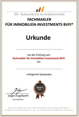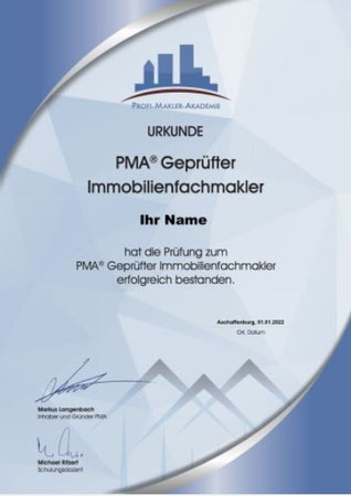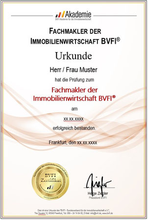 Sie haben die Möglichkeit die Ausbildung mit dem Abschluss "Fachmakler der Immobilienwirtschaft PMA" oder "Fachmakler der Immobilienwirtschaft BVFI" zu absolvieren.