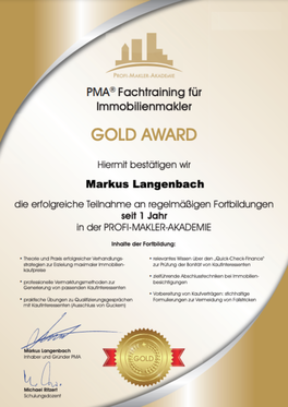 Das Aus- und Weiterbildungsangebot "PMA® 20 Stunden Fortbildungspflicht für Immobilienmakler" eignet sich ideal zur Erfüllung der Fortbildungspflicht. Die gesetzlichen Vorgaben verlangen im Turnus von 3 Jahren Fortbildungsnachweise von 20 Stunden vorweisen zu können. Mit dem Zugriff auf das "PMA® 20 Stunden Fortbildungspflicht für Immobilienmakler" können Sie flexibel und mit freier Zeiteinteilung, diese Stunden problemlos nachweisen.
